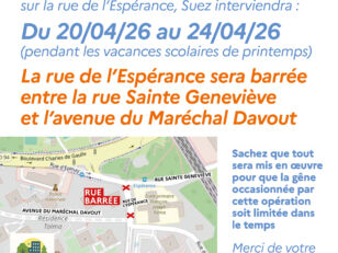 Rue de l’Espérance barrée entre la rue Sainte Geneviève et l’avenue du Maréchal Davout. Du 20 au 24 avril 2026 (Durant les vacances ...