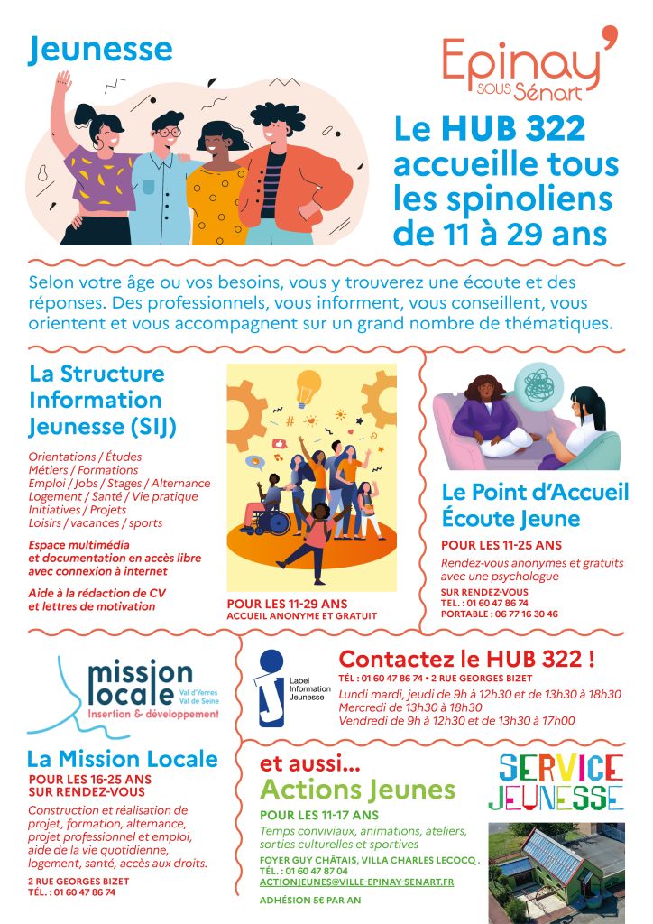 - Actions Jeunes (11-17 ans) : Pour 5€ par an, tu as accès aux animations, ateliers et sorties culturelles/sportives proposées par cette structure (Foyer Guy Châtais, Villa Charles Lecocq / 01 60 47 87 04 / actionjeunes@ville-epinay-senart.fr)