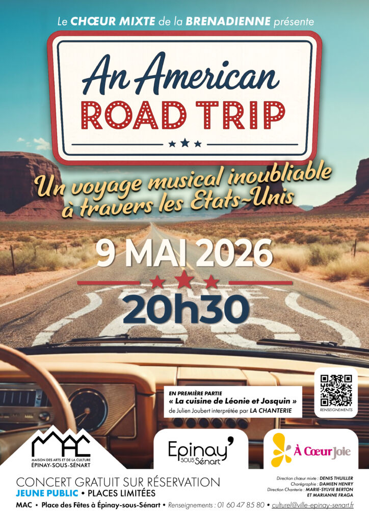Le Chœur Mixte de La Brénadienne sous la direction de Denis Thuillier vous invite à embarquer pour un voyage musical inoubliable à travers les États-Unis. De New York aux vastes horizons de la Californie, ce spectacle trace les contours d’un road-trip vibrant, où chaque étape devient une escale en musique.