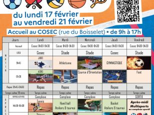 Du lundi 17 au vendredi 21 février de 9h à 17h accueil au COSEC (rue du Boisselet) Au programme : judo, athlétisme, gymnastique, football, ...