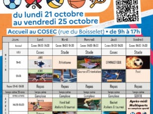Du lundi 21 octobre au vendredi 25 octobre 2024 de 9h à 17h au COSEC, rue du Boisselet, Vos enfants pourront s’amuser, se dépenser, et pratiquer ...