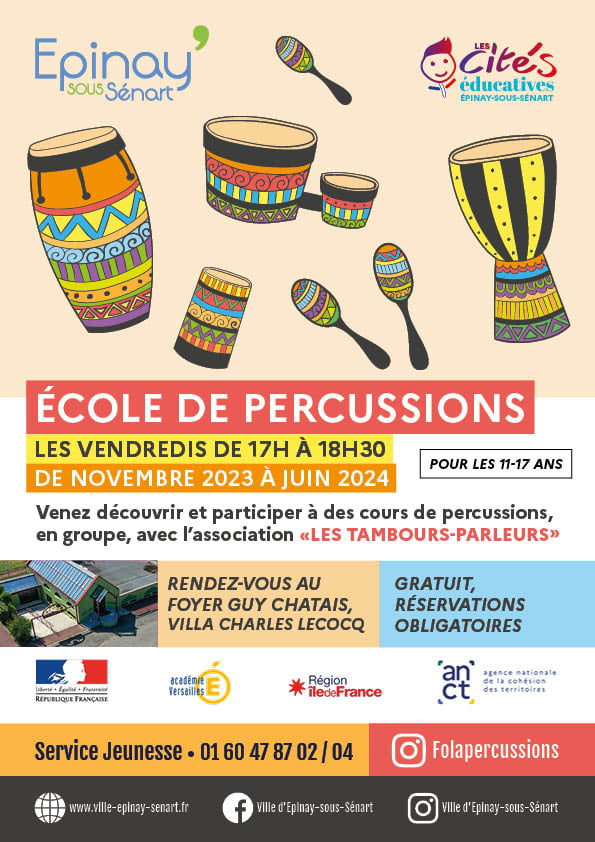 7 novembre 2023 AALes vendredis de 17h à 18h30 de novembre 2023 à Juin 2024 venez participer à des cours de percussions en groupe avec l’association « Les tambours-Parleurs ».Les cours sont gratuit et obligatoire, contact : service jeunesse – 01 60 47 87 02/04