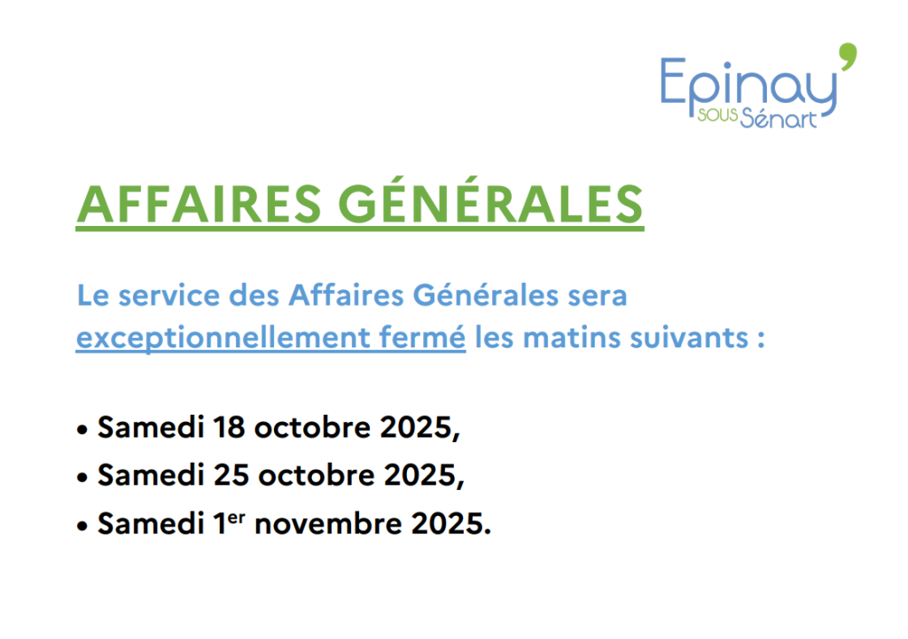 15 octobre 2025 AALe service des Affaires Générales sera exceptionnellement fermé les samedis matins suivants : • Samedi 18 octobre,• Samedi 25 octobre,• Samedi 1er novembre.