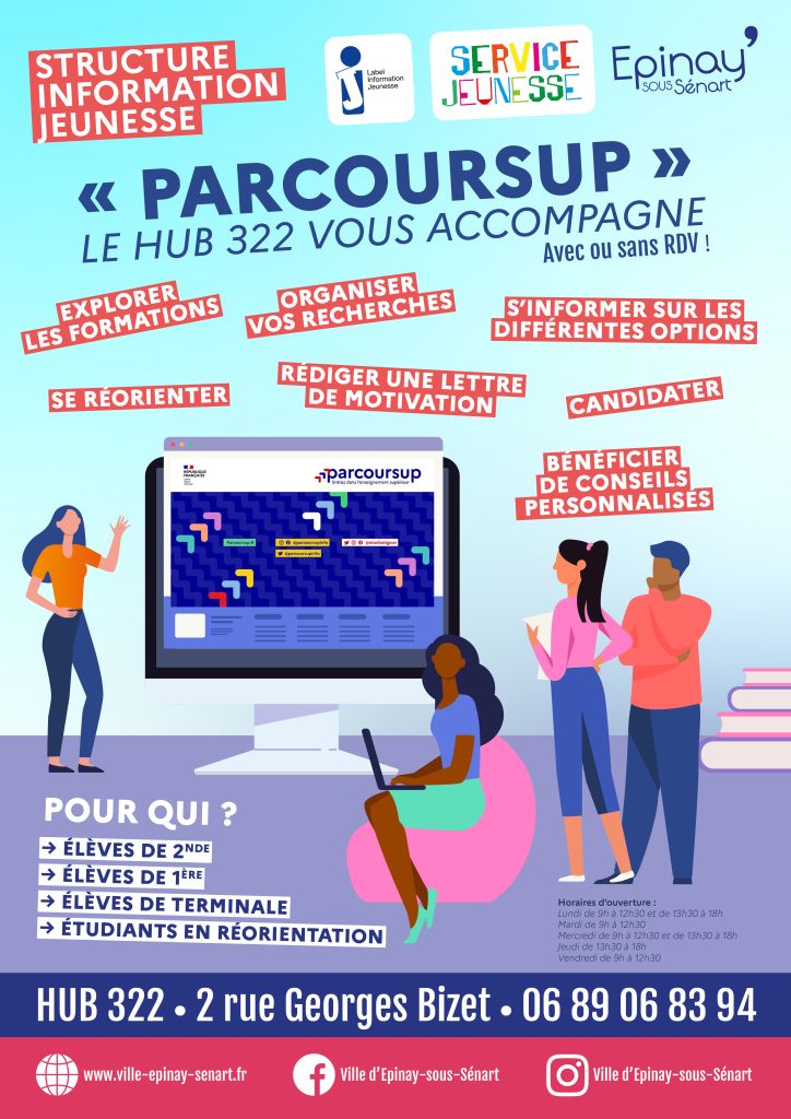 Le Service Jeunesse de la ville d’Épinay-sous-Sénart, en partenariat avec le Label Information Jeunesse, vous propose une aide complète et gratuite pour réussir votre orientation post-bac. Que vous veniez avec ou sans rendez-vous, l’équipe du Hub 322 est à votre disposition pour :