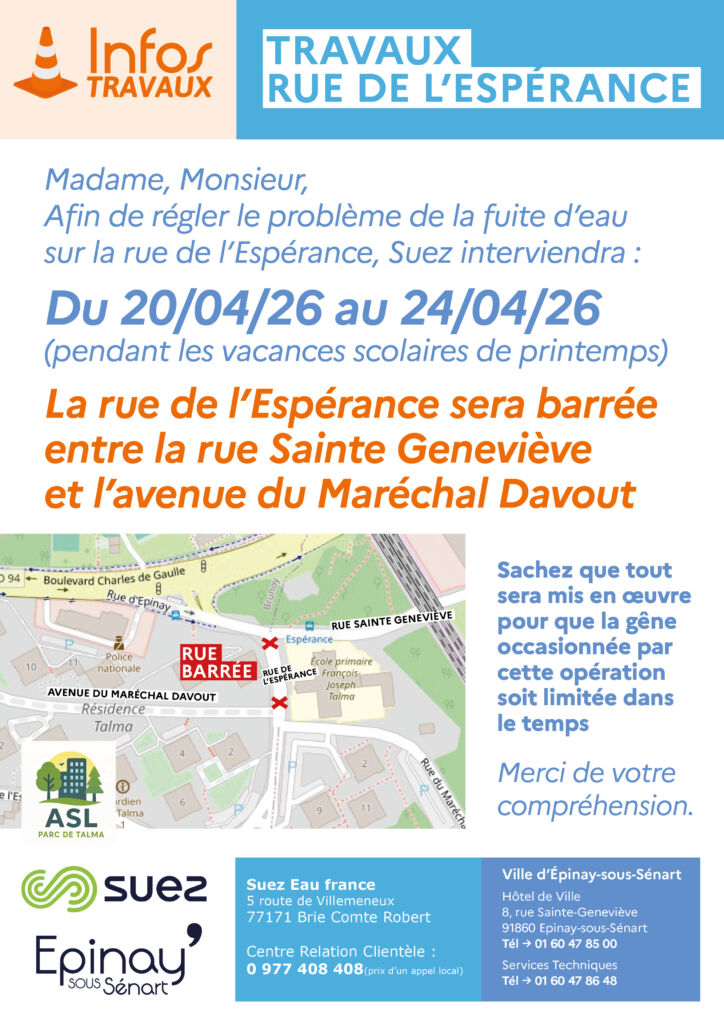 Du 20 au 24 avril 2026 (Durant les vacances scolaires de printemps), Suez interviendra sur place afin de régler le problème de fuite d’eau dans la rue.